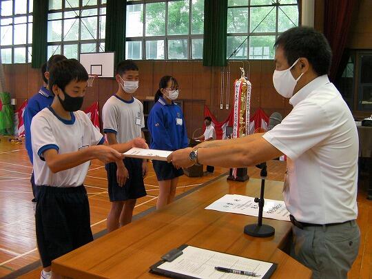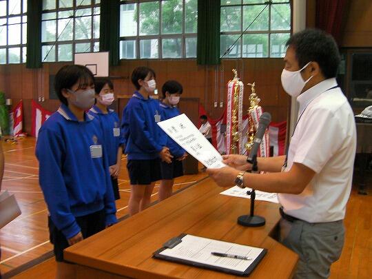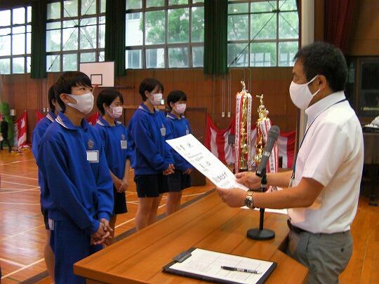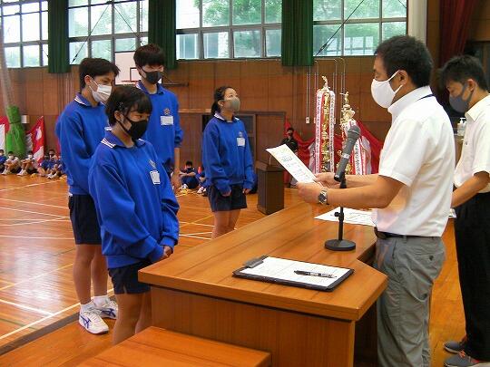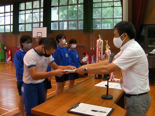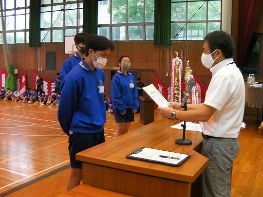 表彰されたのはサッカー部(高円宮杯市内2位)、女子ソフトテニス部(学総大会市内3位)、女子バスケットボール部(学総大会市内3位)、男子バレーボール部(協会長杯市内1位、学総大会埼葛3位)、女子バレーボール部(会長杯市内1位、学総大会市内2位)、男女剣道部(男女とも団体戦市内1位、個人戦男女とも1位から5位までを総なめにしました)、ソフトボール部2埼葛地区1位)、陸上競技部(通信陸上大会、共通男子800m市内3位、1年男子1500m市内1位、県大会1年男子1500m3位、学総大会(共通男子800m市内3位、1年男子1500m市内1位、共通女子砲丸投げ市内2位)男子卓球(学総大会団体戦3位)女子卓球(学総大会個人戦シングルス1位)でした。沼中生の頑張りが光った1学期で、本日の表彰朝会では表彰しきれないうれしい悲鳴です。