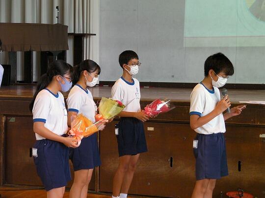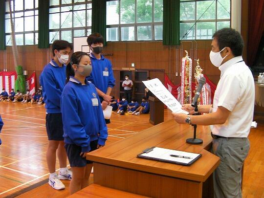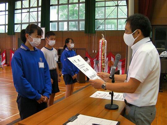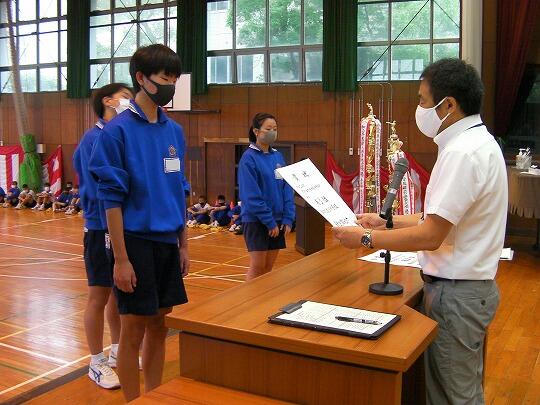 表彰される生徒のみ体育館へ集合し、ライブ映像を各教室で視聴するリモートの形式で行いました。