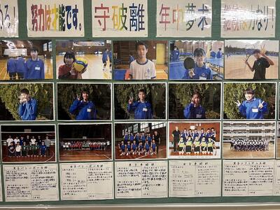 ほとんどの部活が、1・2年生の代となり、新しい部長を中心に活動しています。新しい部長と意気込みが通路に掲示されています。