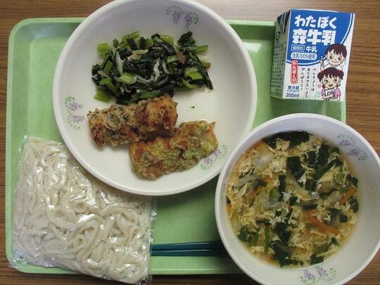 かき玉うどん(地粉うどん、汁)、牛乳、竹輪の二色揚げ、小松菜のソテーでした。