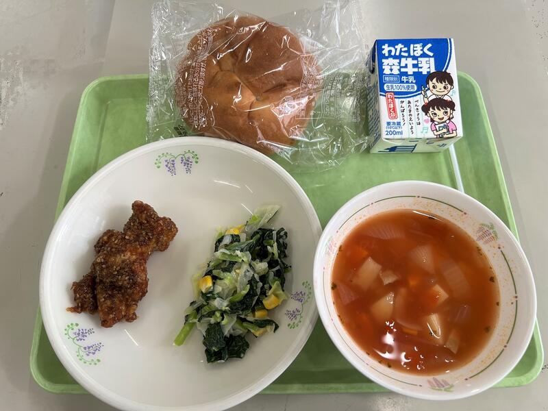 子供パン、牛乳、甘辛チキン竜田、コーンサラダ、ミネストローネでした。