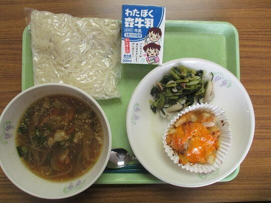 にやしそば(中華麺、汁)、牛乳、ポテトのオーロラソース焼き、小松菜のソテーでした。