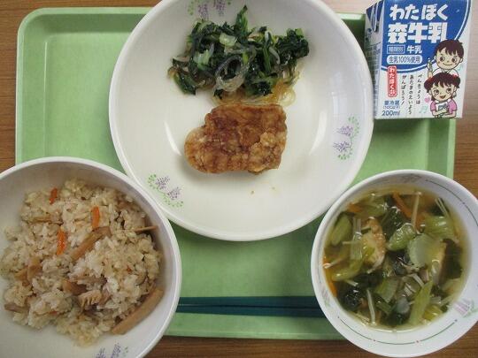 中華風炊き込みごはん、牛乳、鶏肉の黒酢揚げ、春雨サラダ、チンゲン菜のスープでした。