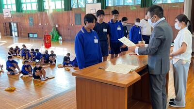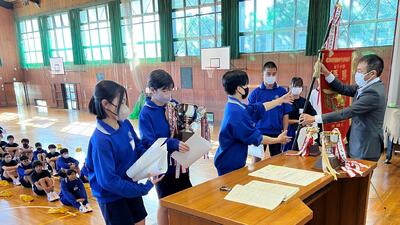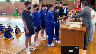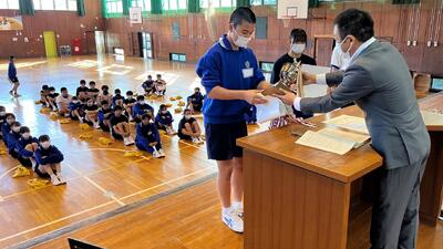本日は表彰朝会が行われました。新人体育大会、ポスター・人権作文・読書感想文・書道コンクールなど、のべ6団体、48個人が表彰されました。詳しくは、学校だより10月号をご覧ください。たくさんの生徒の活躍素晴らしいです。