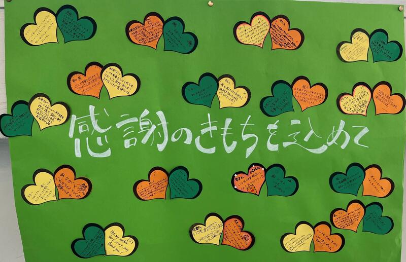 今年度のテーマは「伝え合おう、思いやりの心」で、取組の1つ、親への感謝の思いを伝える掲示物を各クラスで作成しました。三者面談の時に是非ご覧ください。