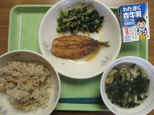 豆ごはん、牛乳、いわしの蒲焼き、ごま和え、みぞれ汁でした。