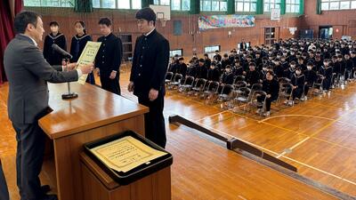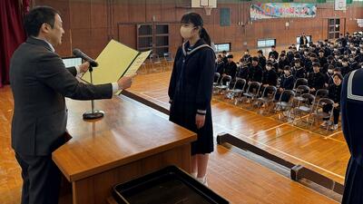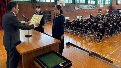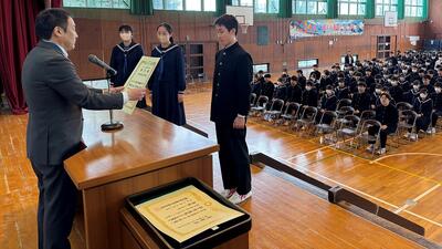 予行後、「埼玉県優良児童生徒」「埼玉県産業教育優良卒業生」「体育優良児童生徒」「全国都道府県対抗男子駅伝大会準優勝」「全国中学生人権作文コンテスト埼玉県大会協議会長賞」の表彰がありました。おめでとうございます。