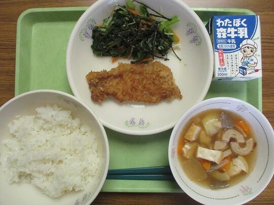 わかめごはん、牛乳、鶏肉のから揚げ、ごま酢和え、みそ汁でした。