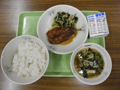 ごはん、牛乳、いわしのかば焼き、かんぴょうの和え物、田舎汁でした。