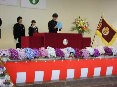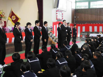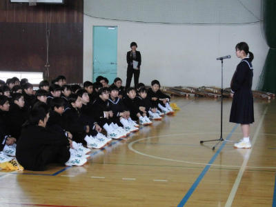 平成27年度始業式前に、新たに転入された先生方の紹介及び各学年の先生方の紹介がありました。式では2年、3年、6・7組の代表生徒による「今年度の抱負」の発表、最後に校長先生から式辞がありました。