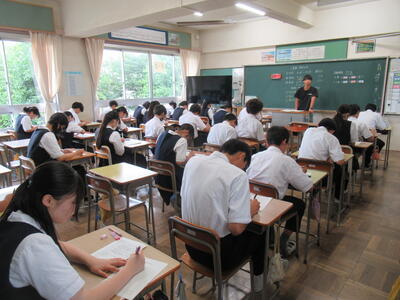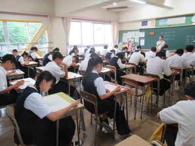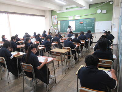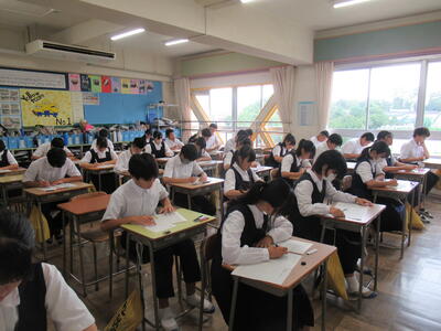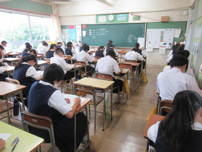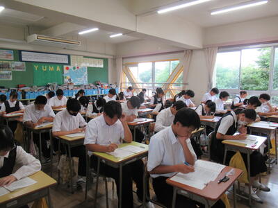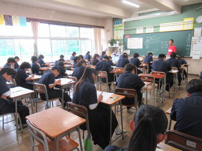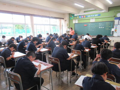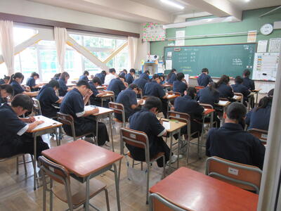 本日、第3学年で第1回の東部地区学力検査を実施ました。進路選択のための資料の一つになる大切なテストの一つですから、どの生徒も持てる力を十分に発揮しようと真剣に臨んでいました。