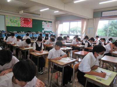 今日、明日の2日間で第1学期「期末テスト」を実施しています。第1学年は「社会、数学、国語」 第2学年は「理科、国語、英語」 第3学年は「社会、国語、数学、技術・家庭」を本日、受考しています。4月からの授業や計画的に進めてきた家庭学習の成果を精一杯発揮して、よりよい成果を収めましょう!