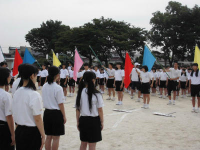 4月に入学した1年生も、団体演技(男子:組み体操、女子:竹ダンス)練習に立派な態度でj取り組んでいます。男子は、ピラミッド、タワーの練習に、心をひとつにして臨んでいます。合図の笛の音で動作の確認を行っています。女子は伝統の竹ダンスに取り組んでいます。いかに美しい線を出すか、という指導を受けていました。当日が楽しみです。
