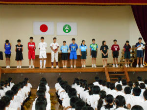 先日行われた「体育祭」の総括です。各学年代表および生活体育委員長からの感想、反省等が発表されました。また、体育主任黒栁先生からの話がありました。みな、達成感や満足感で包まれていました。反省点は来年に生かしましょう。係、委員会のみなさん、ご苦労様でした。