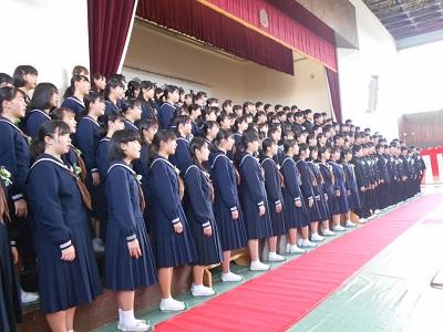 ○卒業式を10日後に控え、卒業式の全校練習が始まりました。紅白のプラカードを先頭に、1組から順に入場します。在校生は卒業生を拍手で迎えるのですが、拍手の際の手の高さや拍手の大きさなどもそろえ、心を込めて式練習に臨んでいます。起立の際の一糸乱れぬ動きは、豊春中ならではのものだと思います。床が横揺れするのを感じると、その気持ちが伝わってくるようです。