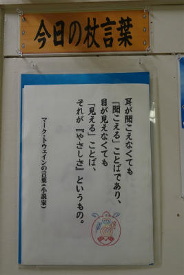 ○1年生は、福祉学習に取り組んでいます。今日の6時間目は、体育館で耳の不自由な家族のビデオを見ていました。みんな真剣に見ていて、これからの取り組みに期待が持てそうです。校長室前の掲示板には、「今日の杖言葉」というコーナーがあります。通りかかった人が見て、何かを感じてくれればいいなぁと思って日々入れ替えています。聞こえることば、見えることばを使いこなせるようにしたいものですね。(校長)