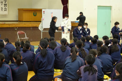 ○作法室では、2年生が箏の演奏に挑んでいました。和楽器を通して、その作法から教えていただいているようです。教室を離れようとすると、「さくらさくら」の演奏が始まりました。先生とともに箏曲部の生徒が手助けをしてくれているのでしょうか、とても上手な演奏が聞こえてきました。