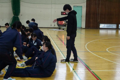 ○3,4時間目の体育館では、先週の1年1,2組に続き、1年3,4組がAED講習を受けていました。真剣かつ意欲的であったとお褒めの言葉をいただきました。小学校で経験済みの生徒は、とても上手だったということです。経験を積むというのは貴重ですね。(校長)