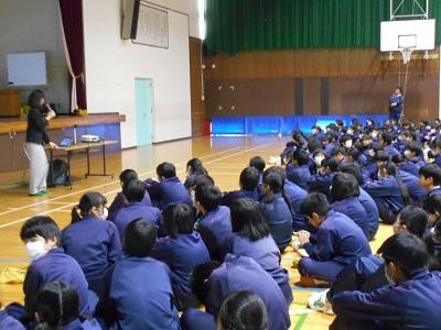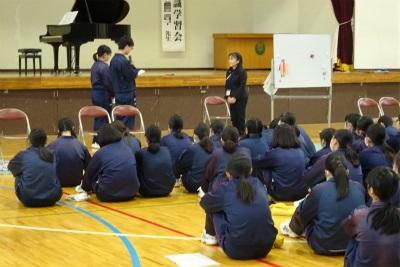 「自分のことだけでなく、人のことを考える必要がある」。「体の不自由な人の大変さが分かったので、これからは進んで声掛けをしようと思う」等の感想が寄せられ、思いやりの気持ちと共に、障害のある人や高齢者についての理解を深めることができました。講師の皆様、ありがとうございました。(教頭)