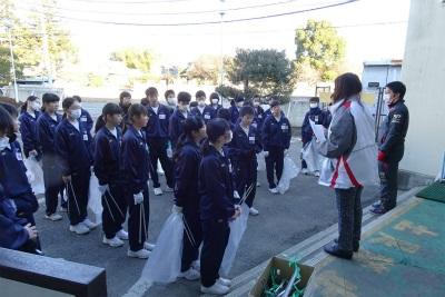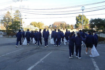 ○そんな寒い日になった今朝は、久しぶりの体育朝会が行われました。整列後は、まず健康観察。確認が終わるまで、みな静かに待っていました。ほとんどの生徒は元気に準備体操を始めました。朝日がまぶしいくらいに生徒たちに降り注いでいます。その後生活体育委員の指示で移動し、学年別のコースに分かれて10分間走。半袖短パンで走る元気な生徒もいましたが、さすがにその数も減ってきました。先生方も無理のない範囲で走って生徒たちを励まし、あるいは励まされながらがんばっていました。青いバトンを持って走っている生徒もいました。後でわかりましたが、「早く走れるアイテム」だそうです。効果は、あったかな? 最後の講評にもありましたが、一人で走るのはつらいけれど、みんなで走ると、そのつらさが嬉しさや楽しさに変わってくるように感じます。この寒さ厳しい冬も、声を掛け合って、励まし合い助け合って、笑顔で乗り越えたいですね。(校長)