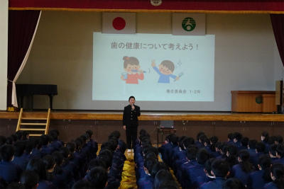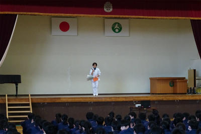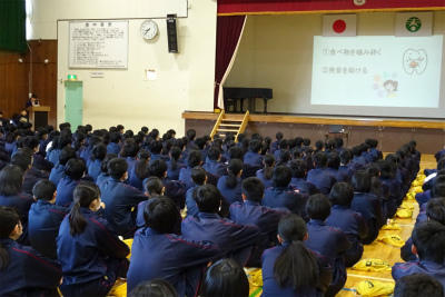 また、みなさんの大好きな「食べること」も、ふだんは当たり前のように感じています。世界には、その日に食べるものもなく困っている人も大勢います。日本においても給食の始まりは、そんな状況から始まったとも言えると思います。毎日おいしい給食を作ってくださる調理員さんへの感謝を、今朝は手紙と花束でお伝えしました。調理員さんは朝の忙しい時間帯にお越しいただきました。ありがとうございます。きょうの給食も残さずきれいに感謝の気持ちでいただきましょう。(校長)