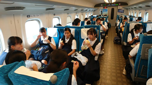 ○今朝は何時に起床したのでしょう、新幹線の中では軽食タイムを待ち焦がれている様子の生徒たち。8時15分の時間がきた途端、車内は美味しそうな匂いが充満しました! (校長)