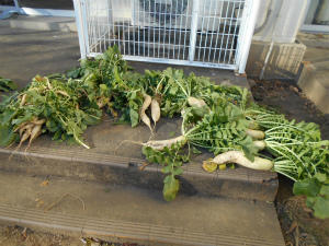 6・7組のみなさんが、丹精込めて育てた野菜の収穫が行われました。大根、白菜、かぶ。どれも大きく育ちました。大根は、青々とした葉がとても立派です。太陽をたくさん浴びて、大きくそだちましたね。水やり、草取り、ご苦労様でした。
