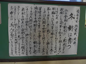 1月16日(月)校内には、校長先生が始業式や終業式でお話しされた言葉が掲示されています。2学期の終業式には「冬、樹は育つ」というお話と「開拓の心」というお話がありました。どちらも中学生の心に響くお話でした。昇降口や廊下などに掲げています。誰しもいただいたお話に心を打たれ、生涯心の残る言葉を持っていると思います。このお話もきっと生徒の記憶に残る言葉となるでしょう。