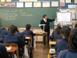 2年生は、社会の授業です。60インチのテレビを活用しています。生徒達も意欲が高まるようです。