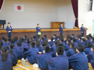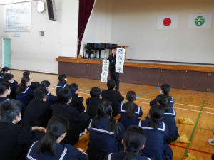 3月6日(月)5・6校時、体育館において「保健講話」が行われました。春日部市助産師会 越谷市立病院勤務の日野暁子さんに御指導いただきました。「月経のしくみや男子の性の悩み 授精から誕生まで 妊娠中絶・避妊・性感染症」についてのお話でした。