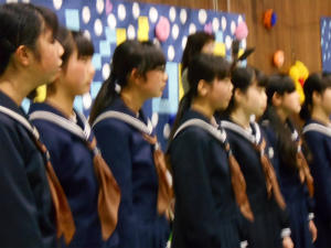 在校生のリコーダー演奏、「世界にひとつだけの花」に迎えられ、担任の先導で3年生が入場しました。その後、懐かしい先生方からのメッセージ、3年の先生方からの手紙に涙する生徒も多かったようです。在校生による合唱「ふるさと」に心が洗われる思いでした。退場は箏曲部演奏による「涙そうそう」です。心温まる会となりました。実行委員会のみなさんをはじめとして、たくさんの人の力に支えられました。ありがとうございました。3年生、よかったね!!
