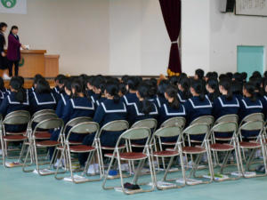 今日は、体育館にて卒業式の練習です。学年主任の鈴丸先生からは「44名の仲間が高校入試という試練に向かっている。仲間のために今できることをがんばってやっていこう」という話がありました。背筋がぴっしと伸びて、立派な練習態度です。