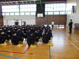 2月17日(金)3年生の埼玉県公立高等学校の出願がいよいよ20日(月)に迫ってきました。今日は、5校時に体育館において事前指導が行われました。時間に遅れないこと、余裕を持って行動すること、アクシデントがあっても慌てないこと、など進路指導主事から話がありました。みんな真剣に聞き入っていました。