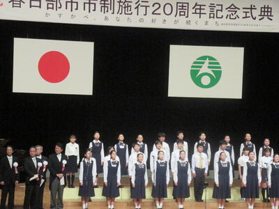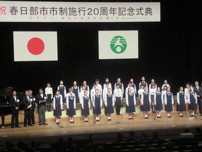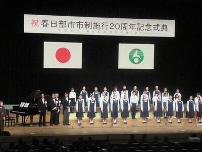 10月4日(土)午後2時から正和工業にじいろホール[春日部市民文化会館]大ホールで、「春日部市市制施行20周年記念式典」が開催されました。本校合唱部が、歌手ナターシャ・グジーさんらと唱歌「ふるさと」を合唱しました。本校合唱部は混声合唱で、ナターシャさんらの歌唱に花を添えました。
