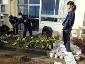 6・7組のみなさんが、丹精込めて育てた野菜の収穫が行われました。大根、白菜、かぶ。どれも大きく育ちました。大根は、青々とした葉がとても立派です。太陽をたくさん浴びて、大きくそだちましたね。水やり、草取り、ご苦労様でした。