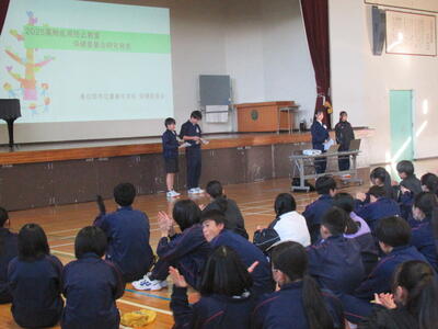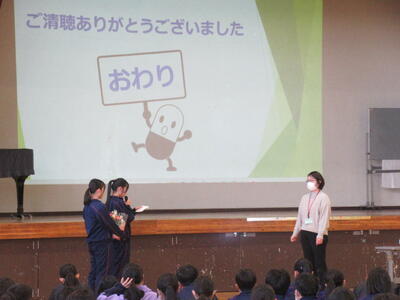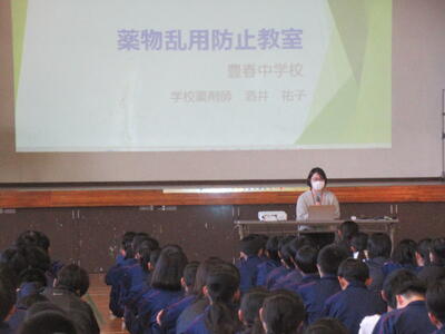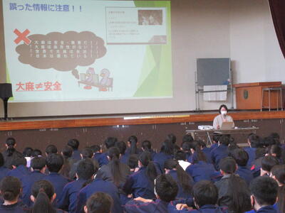 今日の第5校時に全校生徒を対象として、今年度の「薬物乱用防止教室」を開催しました。講師に本校薬剤師の酒井祐子先生をお迎えして、◆お酒とたばこの危険性、◆オーバードーズ、◆身近な薬物乱用、◆大麻の危険性についてご指導いただきました。酒井先生のご指導を前に、保健委員会(生徒会)で実施して集約、分析した「薬物乱用にかかわるアンケート調査結果の報告」がありました。本校生徒の理解や認識の状況(実態)を確認したうえで、酒井先生からご指導いただけた今年度の本教室は、生徒たちの理解と考えがより深められたのではないかと感じました。