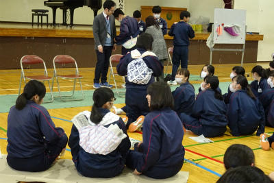 ○3年生は、6時間目に「避難所で役立つ知識学習会」を実施しました。今朝の全校朝会では東日本大震災の時の話を少しさせていただきましたが、あれからもうすぐ7年が経過しようとしています。天災は忘れた頃にやってくると言いますし、備えあれば憂いなしということわざもあります。生徒に聞いてみると、家には風呂敷はないとか。いざというときに身の回りにあるものを使って、どんな風に役立てるか、考えてみる機会を持ってもいいですね。新聞紙のスリッパも、鼻をかんだティッシュのゴミ箱に使えば、感染も防ぐことに繋がるとか。ご家庭でも防災に関する話題を出して、いざというときに備える心構えを持っていただけると助かります。(校長)