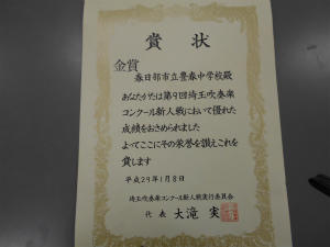 1月8日(日)さいたま市文化センターにおいて「埼玉県吹奏楽コンクール新人戦」が開催されました。本校吹奏楽部のみなさんは、その実力が評価され、見事金賞を受賞しました。今後の活躍に一層期待します。おめでとうございます!!