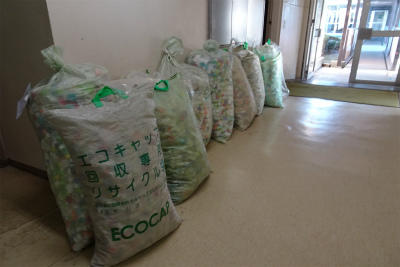 ○福祉委員会を中心に取り組んでいる「エコキャップ運動」ですが、きょうはその回収車が来てくれる日のようです。大きな袋に詰め込んだものが、なんと13袋。一人では大変だけど、みんなで協力すれば、これだけ集まるんだなと、改めてみなさんの心の温かさを感じました。(校長)