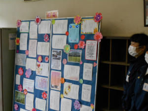 1・2年生が先生と一緒に体育館で式の準備をしています。式場づくりには大変時間がかかります。卒業する3年生の門出のために心を込めて取り組みます。