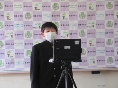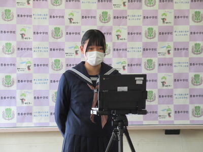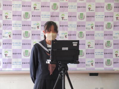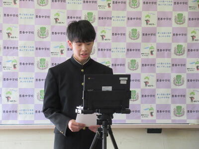 本日はリモートによる朝会で、3年生を送る会実行委員の挨拶と意気込みを発表しました。
