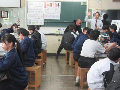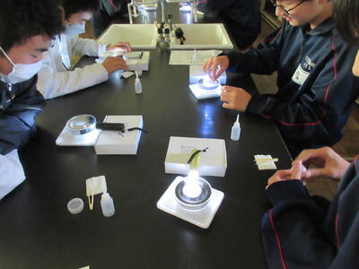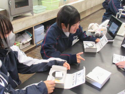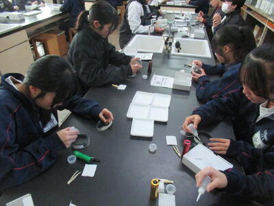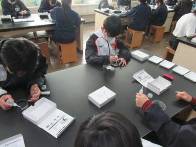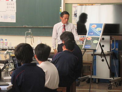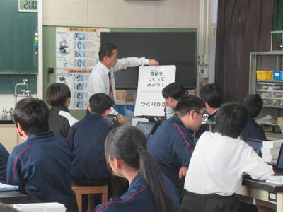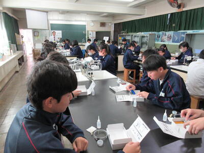 2学年の理科の学習で、「放射線の観察」を行いました。日本診療放射線技師会 業務執行理事(医学博士) 江端 清和 様 にご来校いただき、2学年の全学級を1時間(50分)ずつご指導いただきました。シャーレを使って個人型霧箱を生徒個々に作成し、放射線の飛跡を観察しました。専門家の先生からのご指導や放射線の飛跡観察は、生徒にとって貴重で有意義な学習となりました。