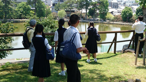 ☆猿沢池の説明を聞く生徒たち