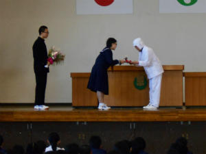 また、表彰朝会に引き続き、「給食感謝集会」行われました。いつもおいしい給食を作って下さる調理員さんに感謝の気持ちを伝えました。食から文化を学び、体を作ります。今後ともよろしくお願いします。