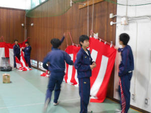 1・2年生が先生と一緒に体育館で式の準備をしています。式場づくりには大変時間がかかります。卒業する3年生の門出のために心を込めて取り組みます。