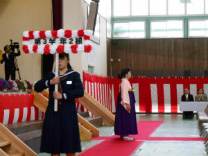 在校生のリコーダー演奏、「世界にひとつだけの花」に迎えられ、担任の先導で3年生が入場しました。その後、懐かしい先生方からのメッセージ、3年の先生方からの手紙に涙する生徒も多かったようです。在校生による合唱「ふるさと」に心が洗われる思いでした。退場は箏曲部演奏による「涙そうそう」です。心温まる会となりました。実行委員会のみなさんをはじめとして、たくさんの人の力に支えられました。ありがとうございました。3年生、よかったね!!