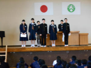 また、表彰朝会に引き続き、「給食感謝集会」行われました。いつもおいしい給食を作って下さる調理員さんに感謝の気持ちを伝えました。食から文化を学び、体を作ります。今後ともよろしくお願いします。