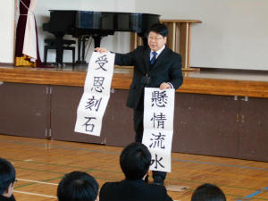 3月10日(金)「埼玉県公立高校入学許可候補者発表」がありました。それぞれが、9:00に受検校に向かいました。11:00には豊春中学校に登校し、各担任に報告を済ませました。おめでとうございます。その後、体育館で集会を行い、齋藤校長先生から「受恩刻石」「懸情流水」の言葉をいただきました。「人に施したことは忘れ、受けた恩は石に刻むように忘れるな」という言葉です。今日という日にしみじみと感じ入ります。