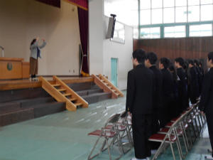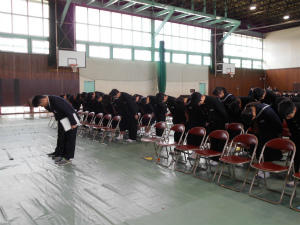 3月8日(水)5、6校時、体育館において「卒業式全校練習」がありました。3月15日(水)にいよいよ第70回卒業式を迎えます。3年生は、今日までに練習を重ね、所作、返事の声の大きさともに齊藤校長先生からお褒めの言葉をいただいています。起立するときに一度前かがみになり、全校生徒の所作が同時になると、体育館が揺れるような感じがします。また、「歌声で体育館の床が揺れる」と言われる本校の卒業式。今年もその準備は着々とできています。