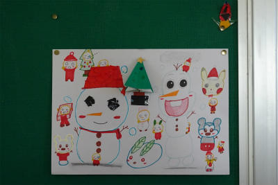 ○6,7組の入口には、かわいらしい掲示物が張られていました。そこで教室をのぞいてみると、英語でゲームをしていました。覚えたフレーズを使って、楽しそうに会話をしている姿は、とても生き生きとしていました。テーマが「クリスマス」ということで、楽しいイメージがどんどん膨らんでいたのでしょうね。